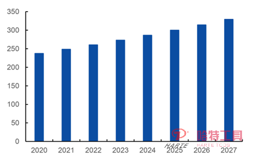 全球金屬切削工具市場規(guī)模達到237.3億美元,預(yù)計在2020至2027年間將保持4.8%年復(fù)合增長率,并在 2027年達到 329.5 億美元。中國刀具消費規(guī)模在2005至2020年間保持7.75%年復(fù)合增長率,2020年約為421億元??紤]制造業(yè)轉(zhuǎn)型升級趨勢不改,“十四五”期間刀具消費市場有望迎來進一步增長,邁上新的臺階。
